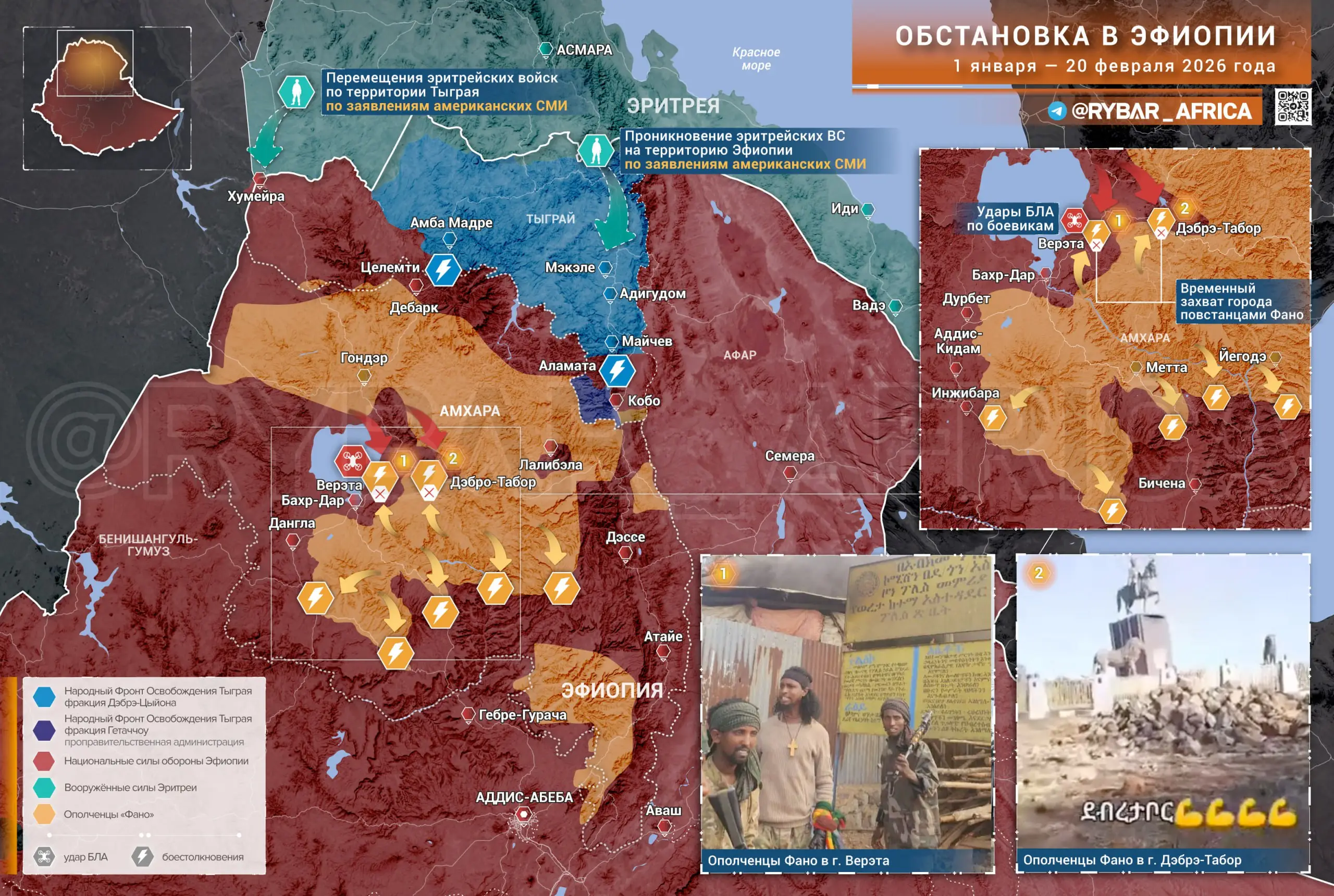 Боевые действия на севере Эфиопии продолжались в формате горных позиционных столкновений малых групп вплоть до февраля. В начале месяца ополченцы народа амхара Фано на время овладели городами Дэбрэ-Табор и Верэта.
