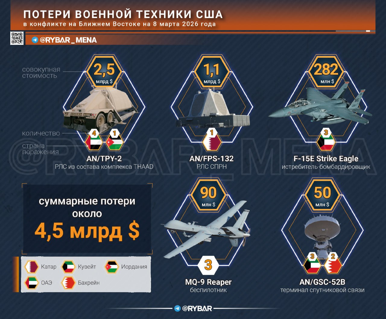 В частности, американцам выбивают сравнительно дорогостоящую технику, которую быстро не воспроизвести. Только за первые дни Иран «настрелял» радаров на сумму от $2,5 до $5 млрд — и это еще не все цели ударов появились на космоснимках.