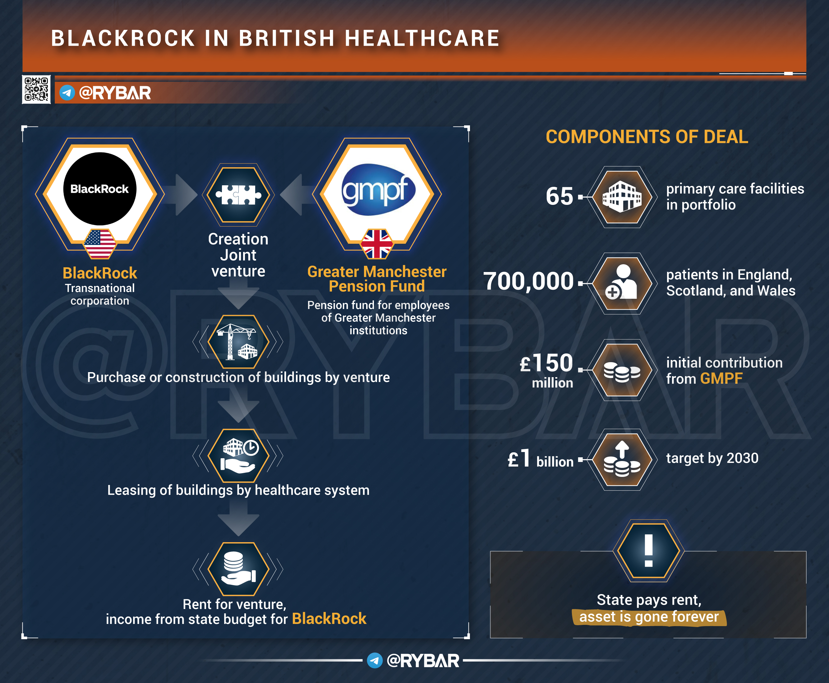 Схема такова: совместное предприятие покупает и строит здания, в которых работают врачи общей практики (GP) и NHS-службы, а потом сдаёт эти здания в аренду. NHS и GP платят долгосрочную ренту. BlackRock получает стабильный доход, обеспеченный государственным бюджетом. Пациенты получают, возможно, более новое здание, но государство лишается самого актива навсегда.