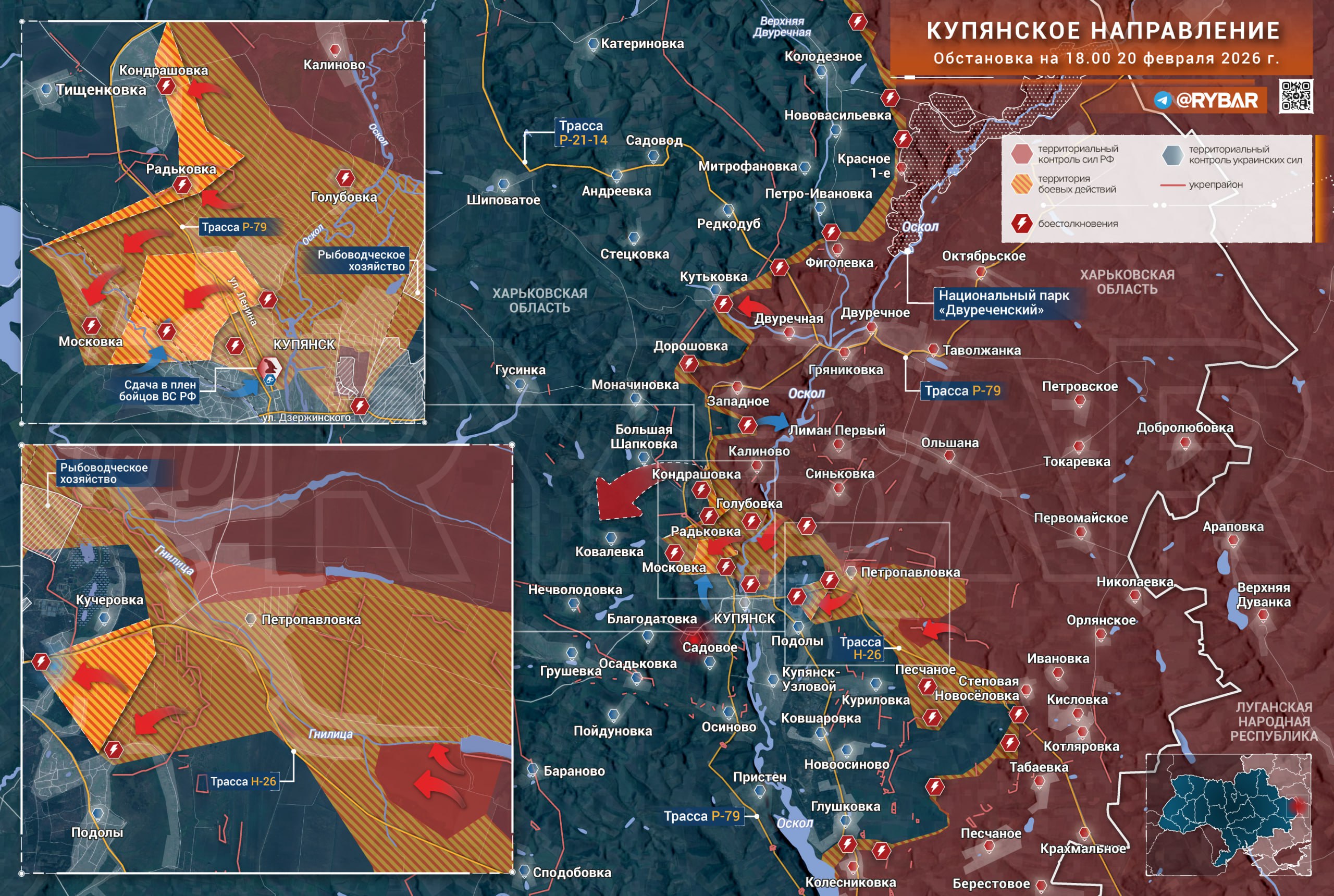 К северу от Купянска малые группы ВС РФ действуют в районах Радьковки и Кондрашовки, заходя на территорию этих населённых пунктов. Расширено присутствие и в районе Московки у северных окраин Купянска. В самом городе обстановка по-прежнему сложная.