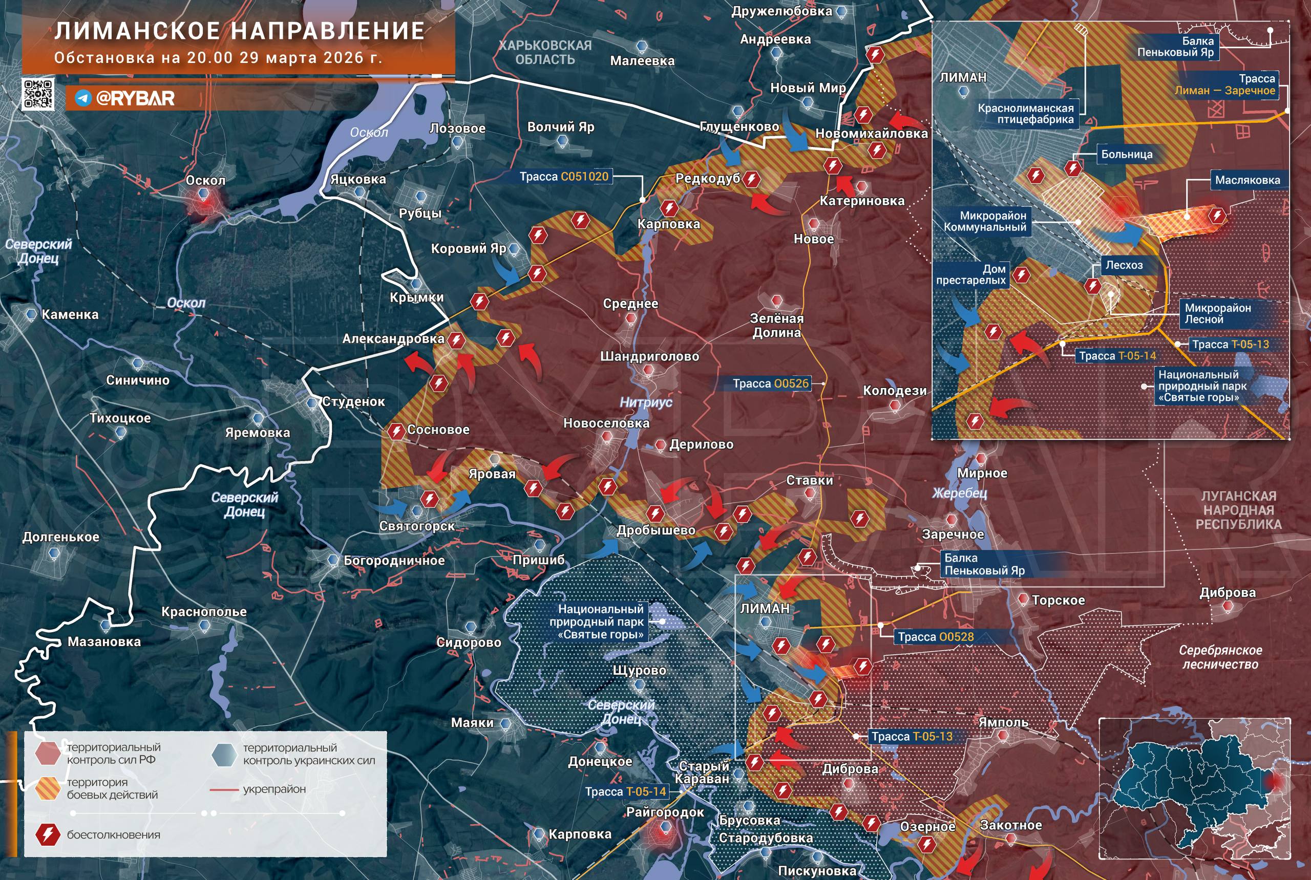 Наиболее тяжёлые бои идут в лесных массивах на рубеже Святогорск — Дробышево. Освобождение населенных пунктов позволит ВС РФ развивать атаки в сторону Пришиба, в окрестностях которого расположены основные переправы, по которым снабжаются силы врага в Лимане.