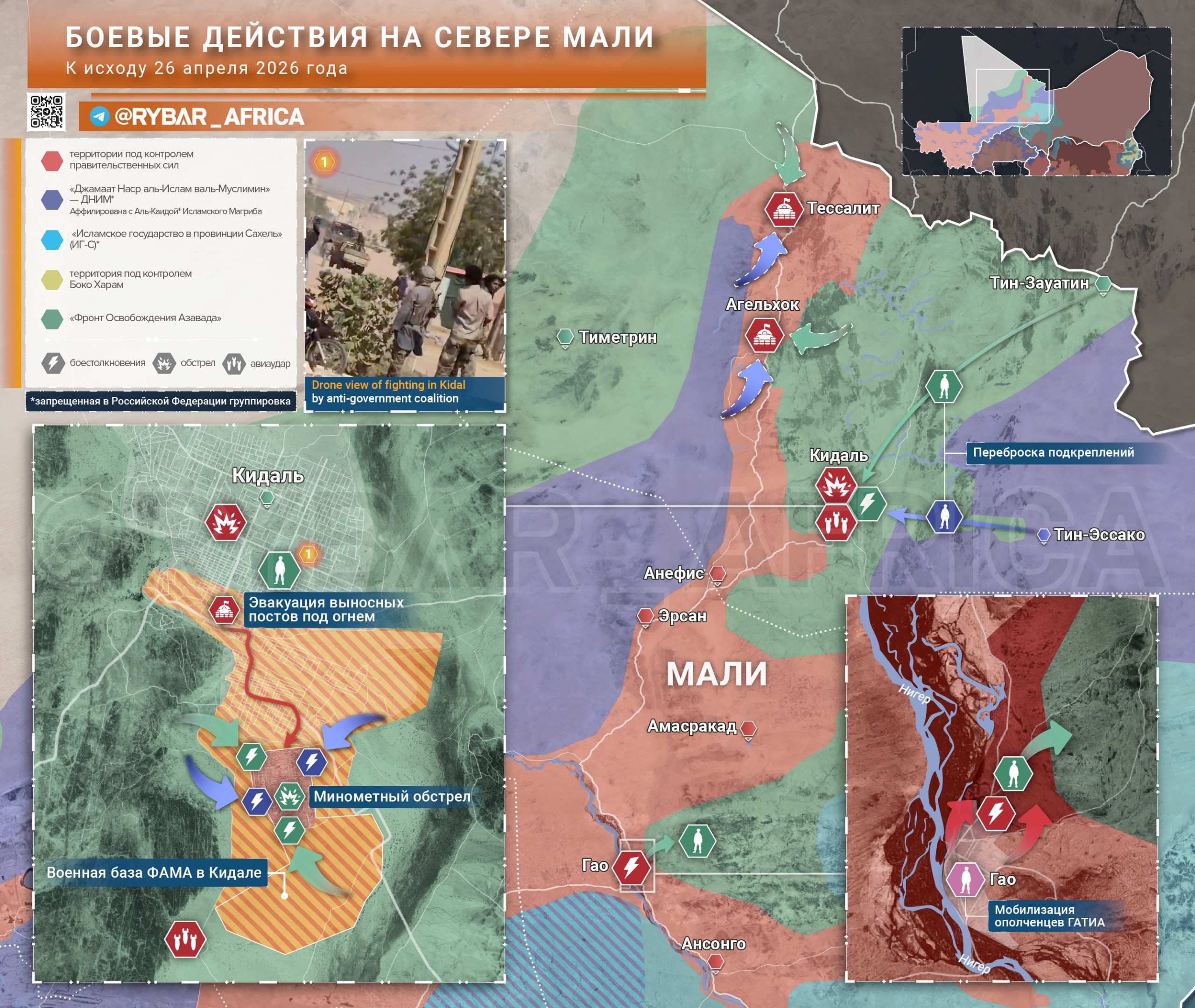 Бои за оплот туарегского восстания продолжаются, несмотря на небольшое затишье. Вопреки заявлениям о «полном контроле», коалиция исламистов и сепаратистов так и не рискнула продвинуться южнее центра города. Продвижение противника сковано страхом перед минными заграждениями и эффективным огнем остающихся в жилой застройке групп военнослужащих.