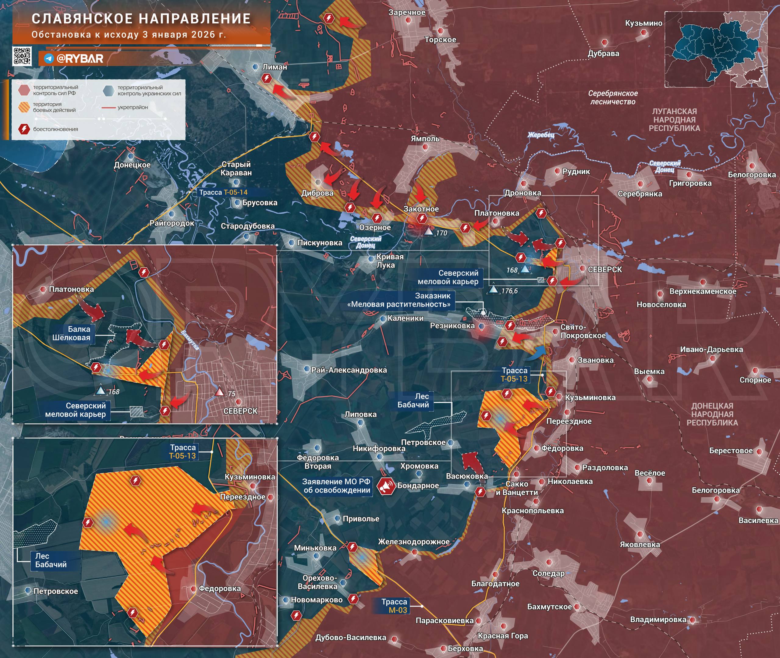 На северном фланге российские штурмовики продвигаются вдоль трассы Т-05-13 со стороны Северска и Платоновки. Это позволит установить огневой контроль над путями снабжения украинских формирований в опорных пунктах у балки Шёлковой и оттеснить их с высот на правом берегу Северского Донца.