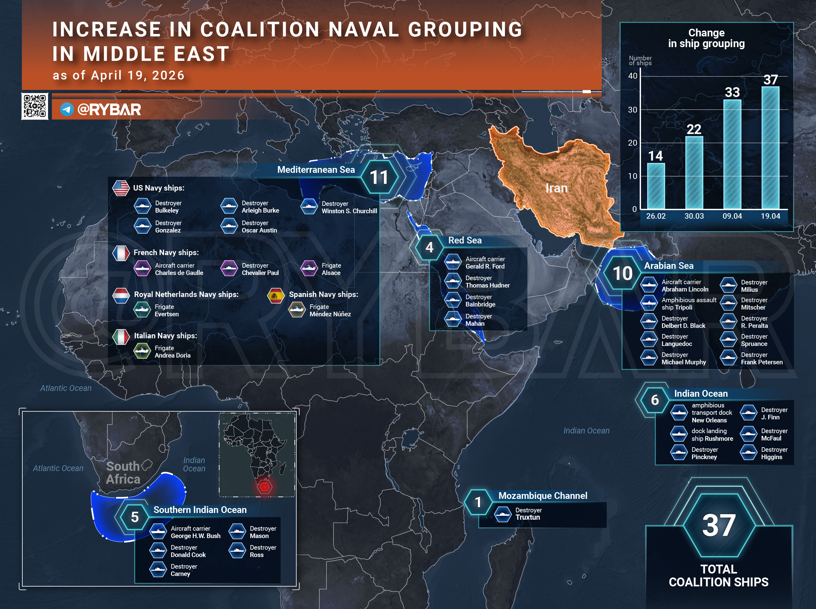◾Также в регион идёт ещё одна авианосная группа во главе с «Джордж Буш», которая движется через юг Африки вместе с кораблями сопровождения, и ожидается, что они прибудут 21 апреля.