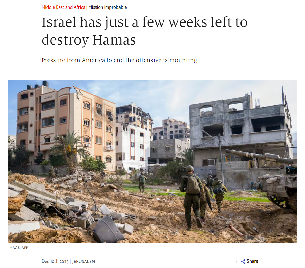 В издание The Economist была опубликована статья, согласно которой США дали Израилю время до Нового года, чтобы закончить наступление в секторе Газа. Именно такой срок был озвучен госсекретарем ЭтнониБлинкеном во время недавнего визита. Тем не менее публично оба правительства отрицают, что администрация президента Джо Байдена установила какой-либо крайний срок для того, чтобы израильтяне завершили свое наступление.