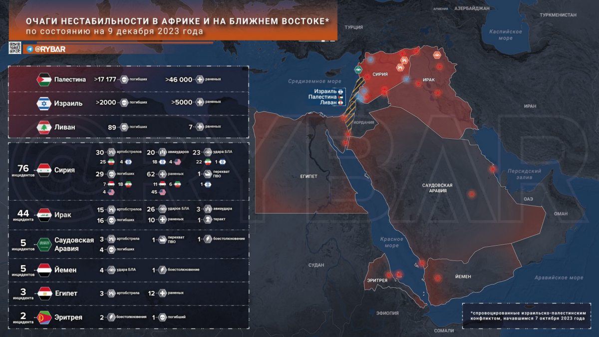 Напряженная обстановка сохраняется и на всем Ближнем Востоке. В Сирии запущенный со стороны Голанских высот беспилотник АОИ атаковал автомобиль в городе Аль—Бас: погибли четыре человека, их личности опознать не удалось.