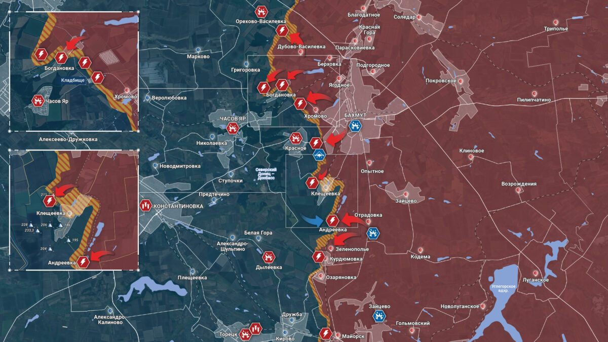 Тем временем на Бахмутском направлении российским войскам удалось несколько расширить зону контроля. У Богдановки штурмовые отряды продвинулись в лесополосе северо-западнее села, а в районе Клещеевки военнослужащим ВС РФ удалось выбить противника с части высот.
