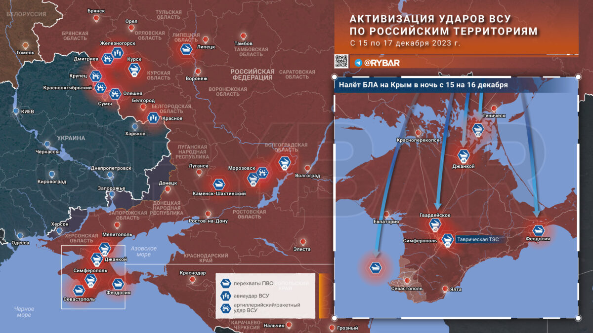 После довольно значительного перерыва украинские формирования ожидаемо возобновили удары по российским территориям. И если обстрелы приграничных областей фактически не прекращались, то налёты дронов и ракетные атаки вглубь не наблюдались длительное время. В ночь на 16 декабря одновременно с попыткой нападения на Курск ВСУ запустили 28 беспилотников в направлении Крыма. Силами 31 дивизии ВВС и ПВО были поражены все дроны, и ни один из них не достиг цели. По географии их поражения можно сделать вывод, куда целился противник: аэродромы базирования российской авиации, а также энергетические объекты у Симферополя и в Феодосии.