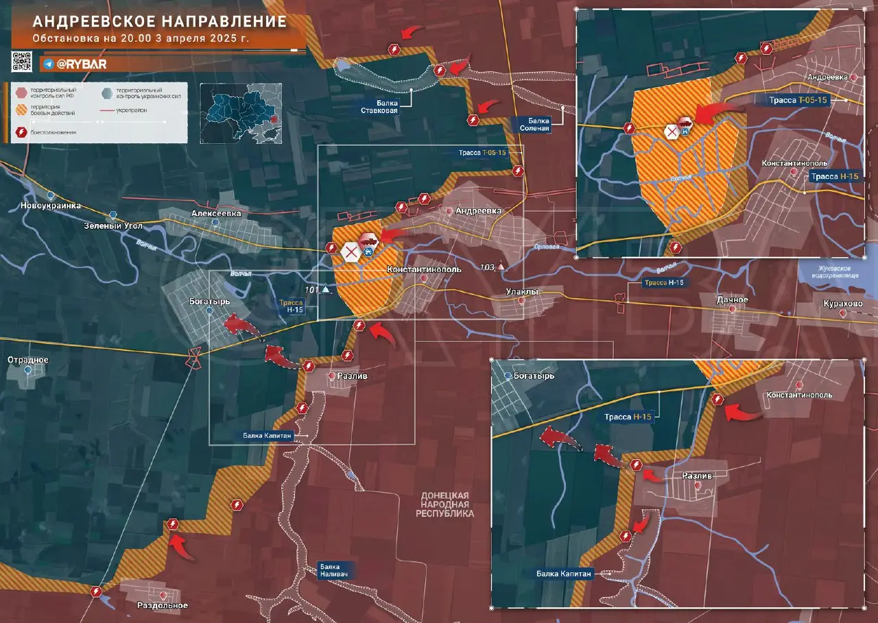 На Андреевском направлении продолжается наступательная операция российских войск сразу на нескольких участках фронта. Российские войска атакуют как в направлении Алексеевки, так и в сторону Богатыря.