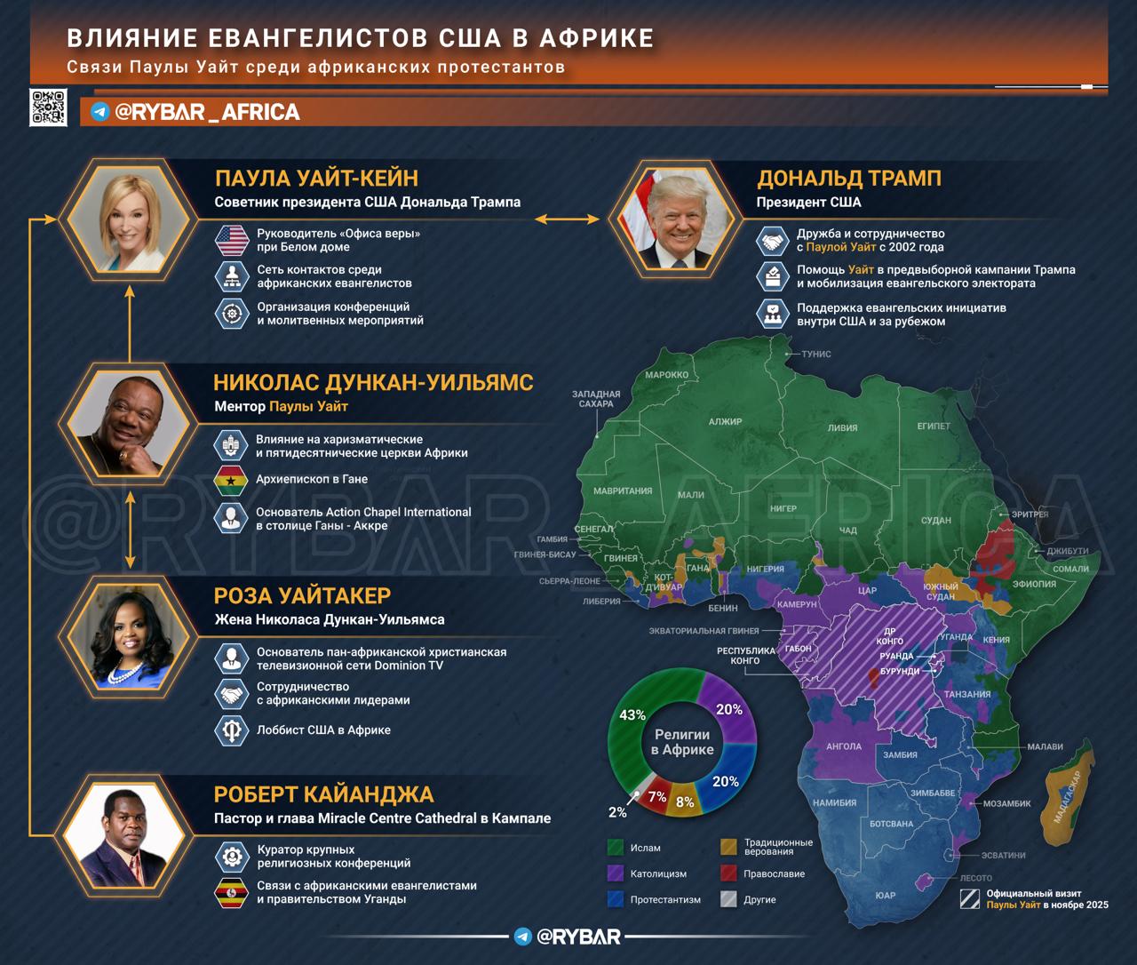 Духовная миссия уже не первый год служит интересам Дональда Трампа. Но если ранее евангелисты помогли Трампу прийти к власти, то теперь они помогают продвинуть интересы США в Африке. Главную роль в этом направлении играет пастор и телеевангелист Паула Уайт‑Кейн.