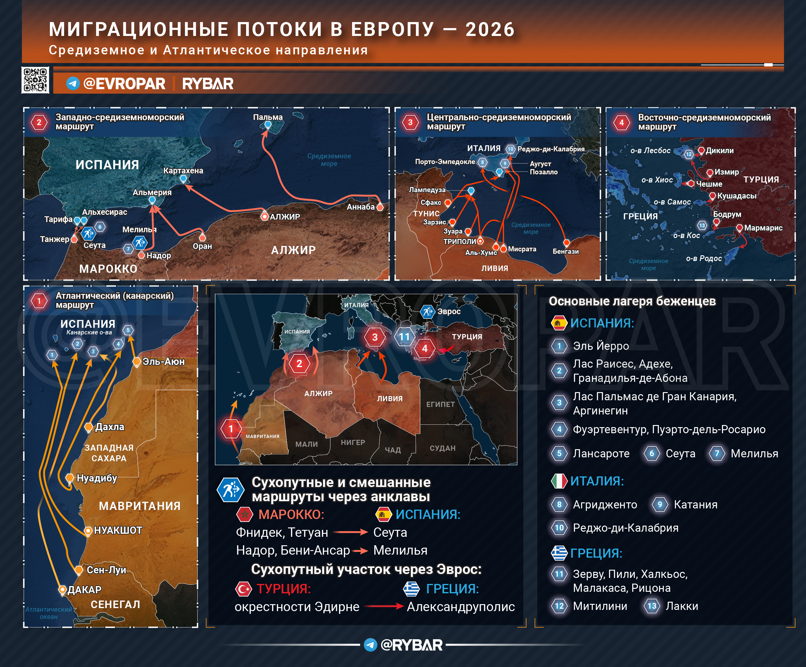 Беженцы едут по четырём основным маршрутам: из Туниса и Ливии морем добираются в Лампедузу и другие южные итальянские города, из Турции — на греческие острова, из Марокко и Алжира — в испанские Андалусию и Балеары, из Западной Африки — на Канары, а по суше — из Марокко в анклавные Сеуту и Мелилью и оттуда уже — в континентальную Испанию.