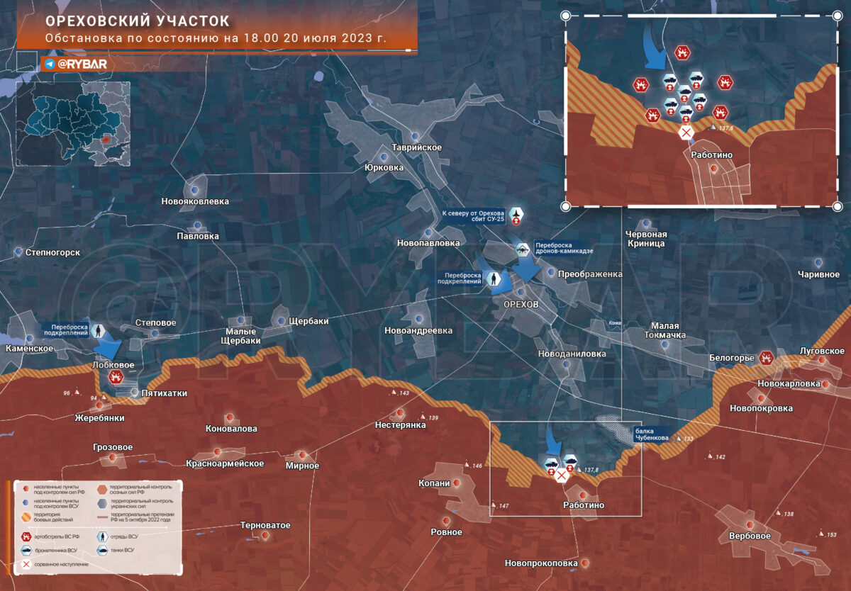 Также отмечаются потери и в реактивном дивизионе 65 омбр ВСУ, который из-за проводимого наступления на Работино был перемещен ближе к передовой, что и привело к уничтожению и личного состава, и техники. Сейчас ВСУ вдоль ЛБС ожидают переброску подкреплений к линии фронта. К Лобковому прибыла новая штурмовая группа 128 огшбр. При этом все мероприятия идут под прикрытием артиллерии и авиации.