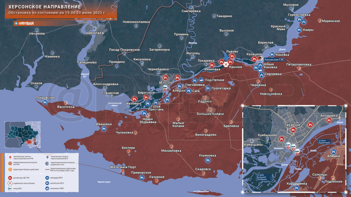 Сейчас вдоль Днепра ВСУ ведут артподготовку. Цель этого пока что неясна, так как массовое форсирование реки Днепр выглядит на данном этапе маловероятным. Однако интенсивность ракетных ударов самолётами тактической авиации и РСЗО HIMARS высока. И основной целью, по всей видимости, является поражение тыловых объектов ВС РФ.