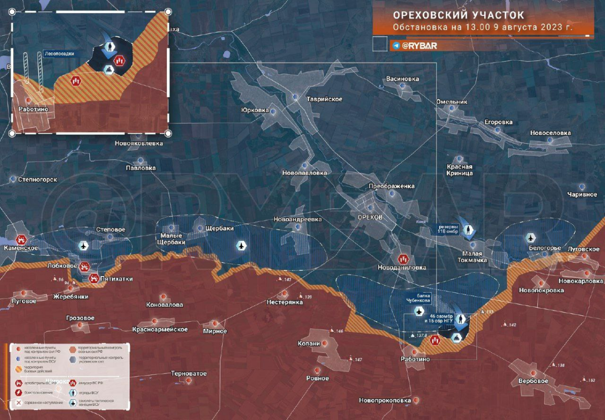 Поздно вечером на Ореховском участке вчера и ночью 9 августа сводные штурмовые подразделения 46 оаэмбр при поддержке 15 бригады нацгвардии Украины в очередной раз атаковали позиции ВС РФ восточнее Работино. Перед этим саперы двух бригад сняли минные заграждения и перешли в атаку с задачей вклиниться в оборону на 400 метров между двумя сёлами. В результате боёв ВСУ закрепились в 3 км восточнее Работино.