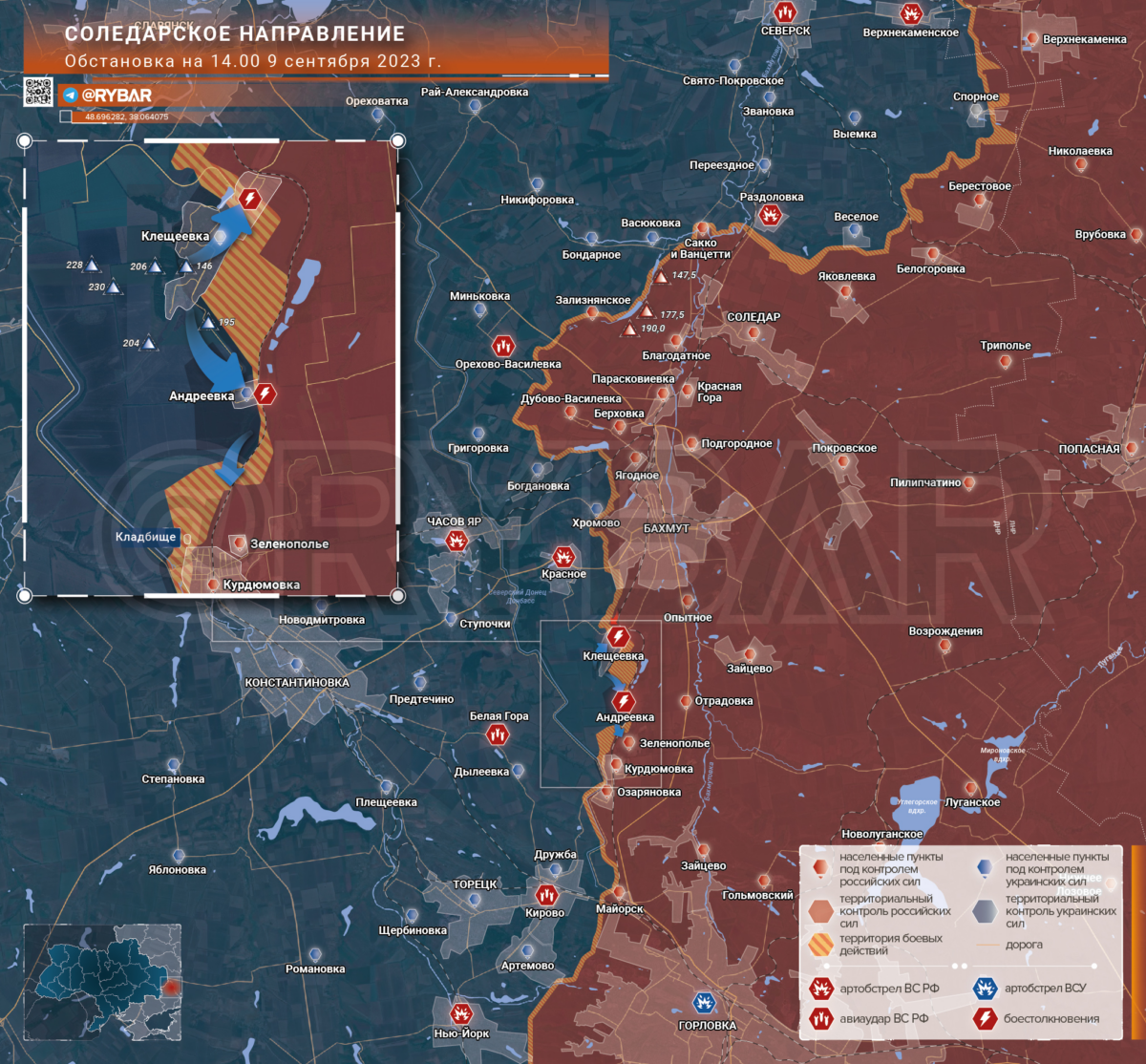 На Соледарском направлении украинские формирования продолжают пробиваться к железнодорожному полотну на юго-западе от Бахмута : после прохода к северо-восточной окраине Клещеевки ВСУ ударили у Андреевки. В результате ожесточенных боёв подразделения противника смогли вытеснить бойцов российской армии из села. По некоторым данным, линия контроля ВС РФ проходит по ж/д ветке. Косвенно это подтверждается активностью украинских разведгрупп к северу от Курдюмовки. Отряды на бронемашинах двигаются к северу от российского укрепрайона, чего не могло бы быть в случае присутствия ВС РФ в Андреевке. В Клещеевке также идут столкновения. Подразделения ВС РФ удерживают северо-восточную окраину и пытаются контратаковать. До железнодорожного пути расстояние составляет около 400 метров.