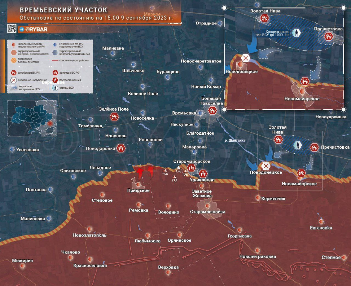 Тем временем на Времьевском участке украинским формированиям ценой потерь удалось занять два дома на северо-востоке Новомайорского, а у Новодонецкого все атаки были успешно отражены подразделениями ВС РФ. При этом севернее Приютного российские войска расширили зону контроля в районе балки Грушевой.
