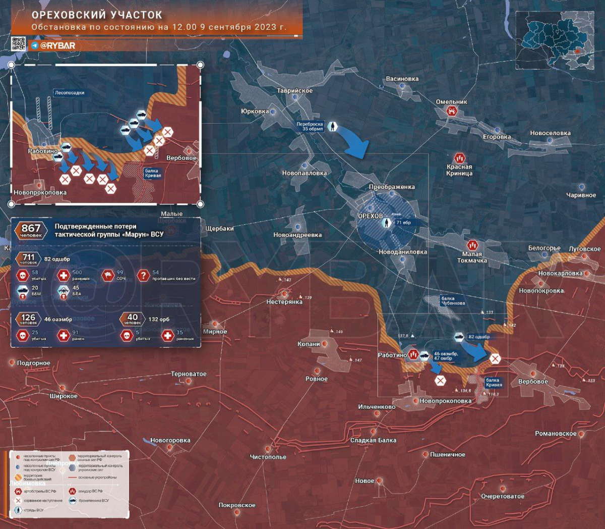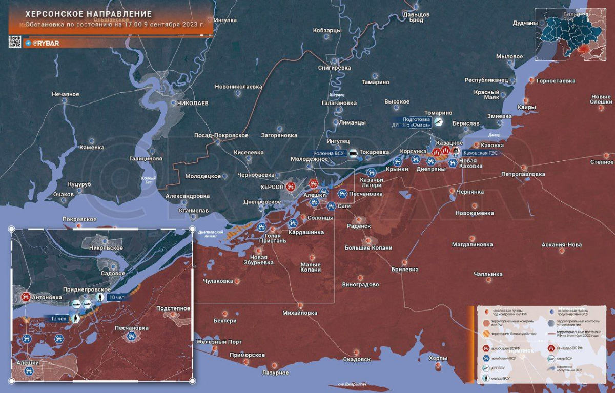 То есть при учёте предыдущих высадок на левобережье Днепра у ВСУ есть небольшие плацдармы у Антоновского и железнодорожного моста, на острове Алешкинский, западнее Казачьих Лагерей, а также возобновятся попытки на Казацкий. Всё это сопровождается массированным огнем из ствольной и реактивной артиллерии 406 оабр, а также минометных расчетов и операторов FPV-дронов. Учитывая усиление группировки ВСУ у Днепра и всё более массовые вылазки ДРГ вместе с перемещением позиционного района ПВО ЗРК «Спада» на юг, можно предположить, что украинские формирования готовятся к нападению, которое, скорее всего, намерены координировать с действиями на Ореховском и Времьевском участках.