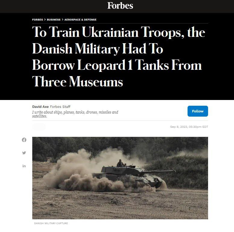 Любопытную статью опубликовали в Forbes, где под заголовком «Датчанам пришлось позаимствовать танки Leopard 1 из трех музеев для обучения украинских экипажей», рассказали об использовании старой бронетехники, уже давно выведенной из боевого состава. Информацию о «рухляди, на которой проходит обучение и острой нехватке танков первого поколения на Западе», моментально подхватили отечественные каналы и СМИ, говоря об имеющихся проблемах за рубежом.