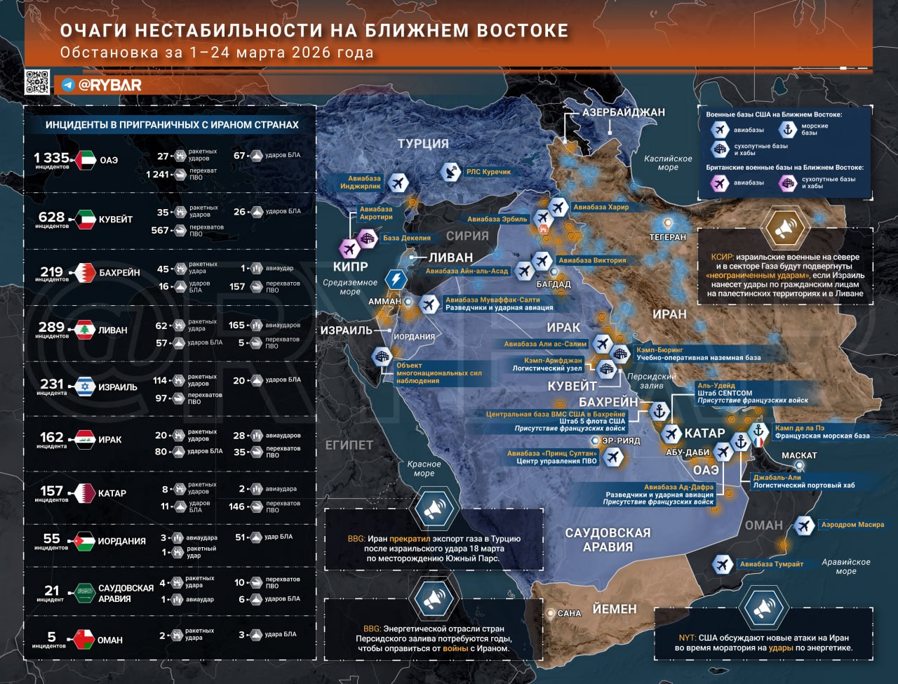 К исходу суток удары по территории Ирана продолжились, несмотря на заявленный «мораторий». В Исфахане и Хорремшехре зафиксированы прилеты в районы газовой инфраструктуры. При этом иранская сторона отрицает наличие переговоров с США, а также сообщает о массовых задержаниях лиц, подозреваемых в передаче информации противнику.