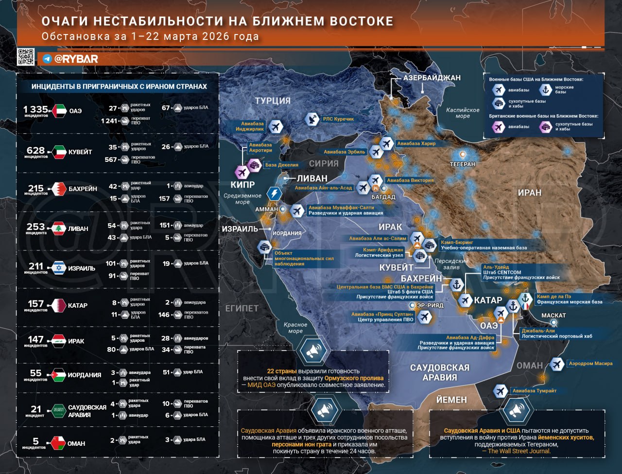 На двадцать третий день войны коалиция продолжила удары по Ирану, а иранцы — ракетные атаки по Израилю. Одновременно усиливается давление на Ормузский пролив, энергетику и логистику региона.