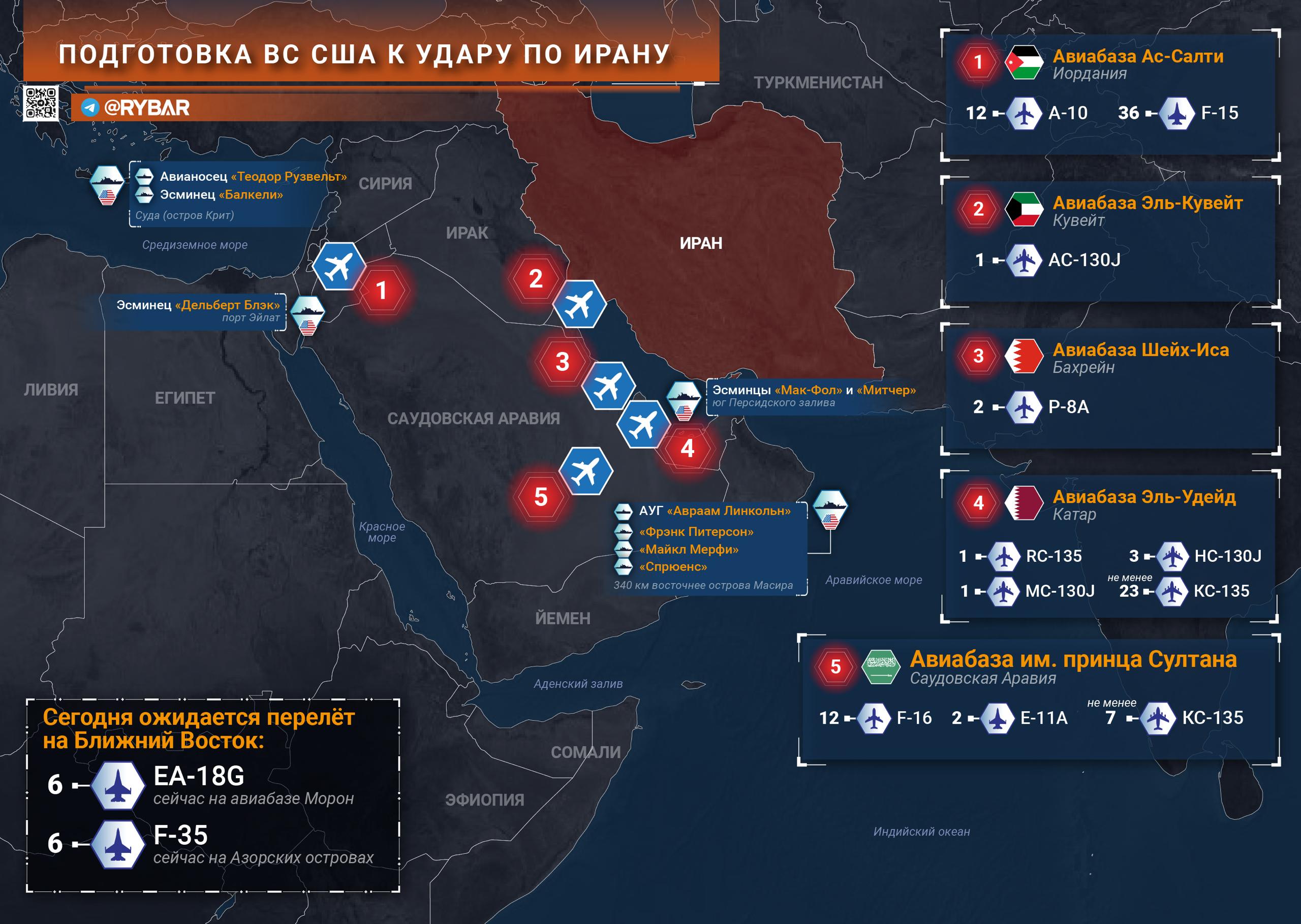 Прямо сейчас к Ближнему Востоку летят три заправщика КС-46 с авиабазы Морон (Испания) и, скорее всего, они сопровождают истребители E/A-18G, а также F-35 c Азорских островов, что увеличит группировку тактической и специальной авиации ВС США.