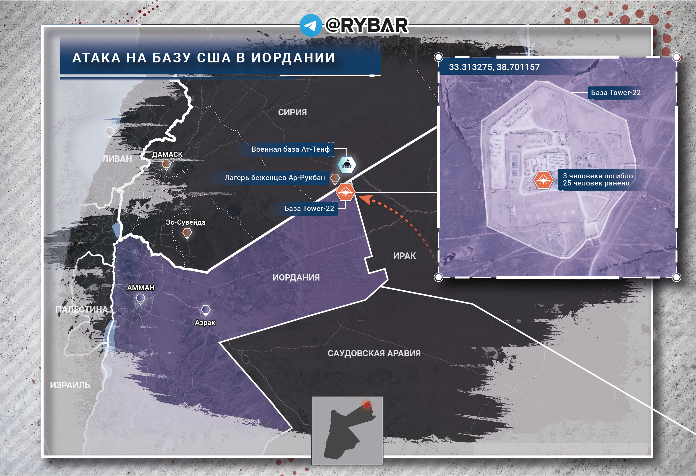 Проиранские формирования запустили беспилотник по аванпосту Tower 22 в Иордании: в результате атаки погибли 3 и получили ранения еще 25 американских военнослужащих. Сам объект находится неподалеку от погранперехода Ар-Рукбан, одноименного лагеря беженцев и базы Ат-Тенф, где расположен лагерь подготовки группировки «Джейш Сурия аль-Хурра» (эксДжейш Магавир ас-Саура»).
