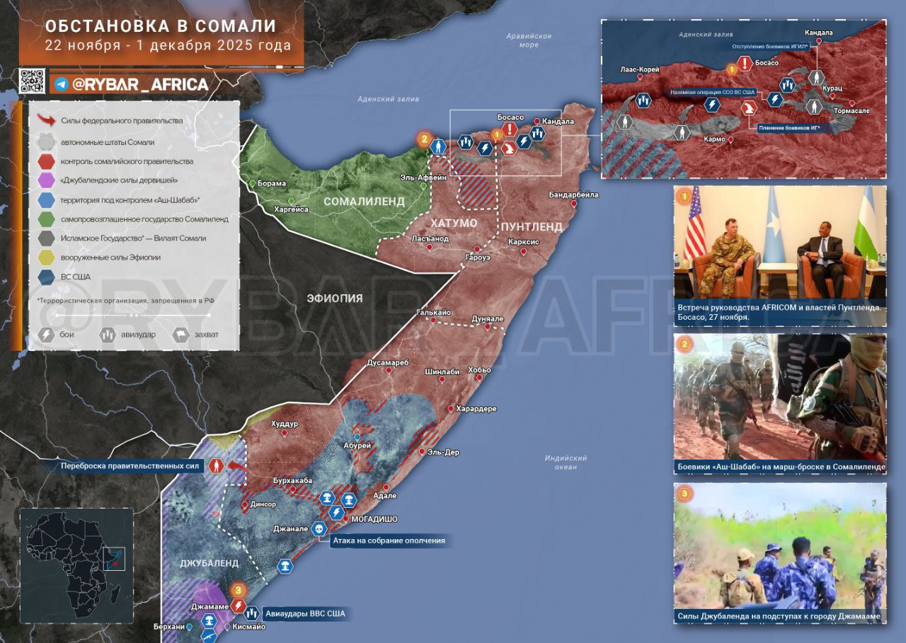 На северных территориях силы Пунтленда с опорой на американские авиаудары методично выдавливают боевиков «Исламского государства». К югу от горных районов Каль-Мадоу и Каль-Мискаад также присутствуют и сторонники группировки «Аш-Шабаб», но их активность пока минимальна.