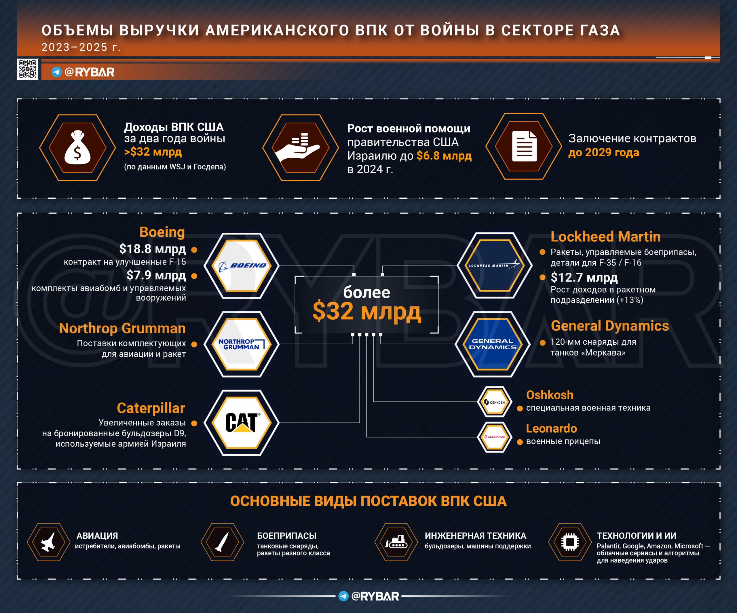 Война в секторе Газа стала одним из самых доходных конфликтов для американской оборонки. По данным Wall Street Journal, только за два года через американский «военный конвейер» прошло более $32 млрд контрактов на вооружение для израильтян — и эта цифра продолжает расти.