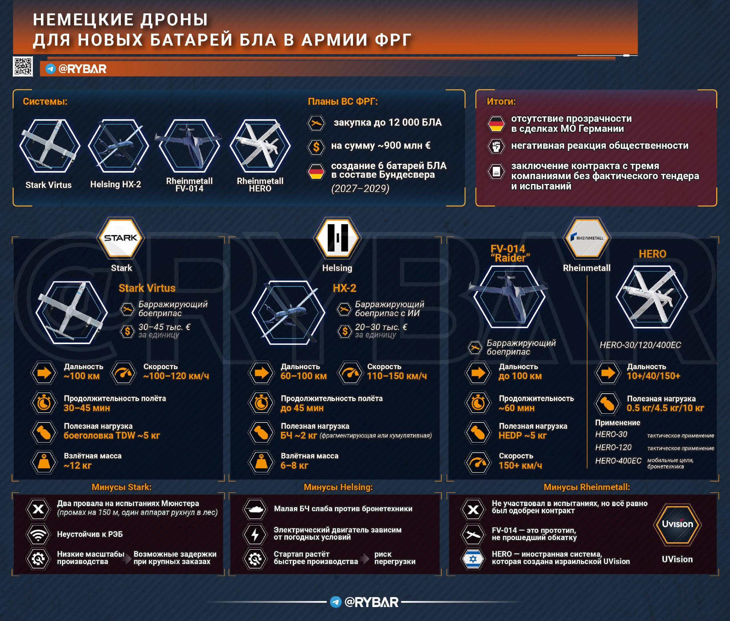 Дроны от Rheinmetall и их состояние – большой вопрос. Тем более серия HERO – это БЛА израильской компании UVision, и есть большие сомнения, что они по итогу доберутся до ФРГ с учетом политической ситуации вокруг Израиля. Однако контракт Rheinmetall отдали.