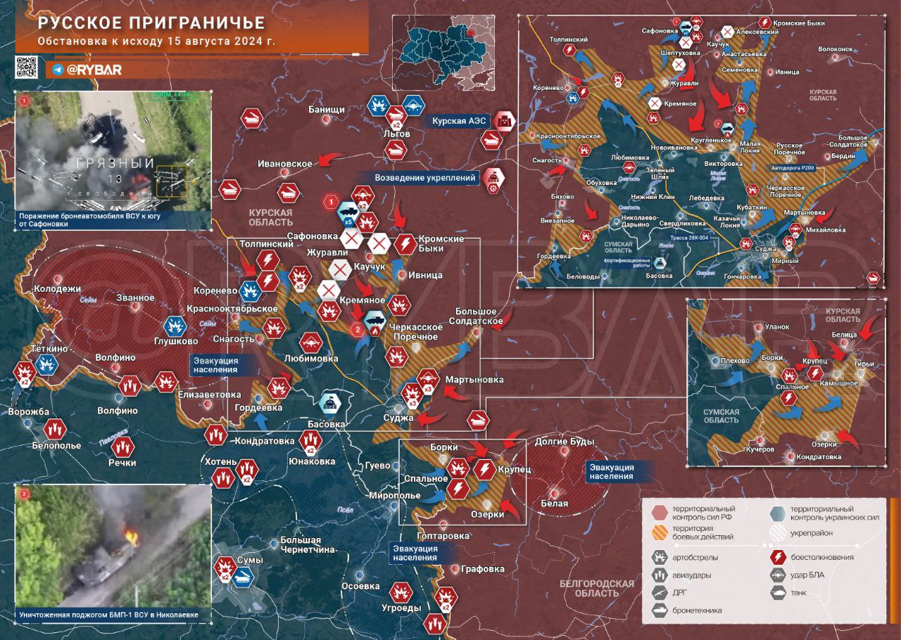В Суджанском районе обстановка к исходу дня значительных изменений не претерпела. На участке продолжаются бои и вылазки украинских диверсионных групп. В районе Малой Локни в Николаевке боец местной дружины самообороны сжег канистрой с бензином брошенный БМП-1 ВСУ.