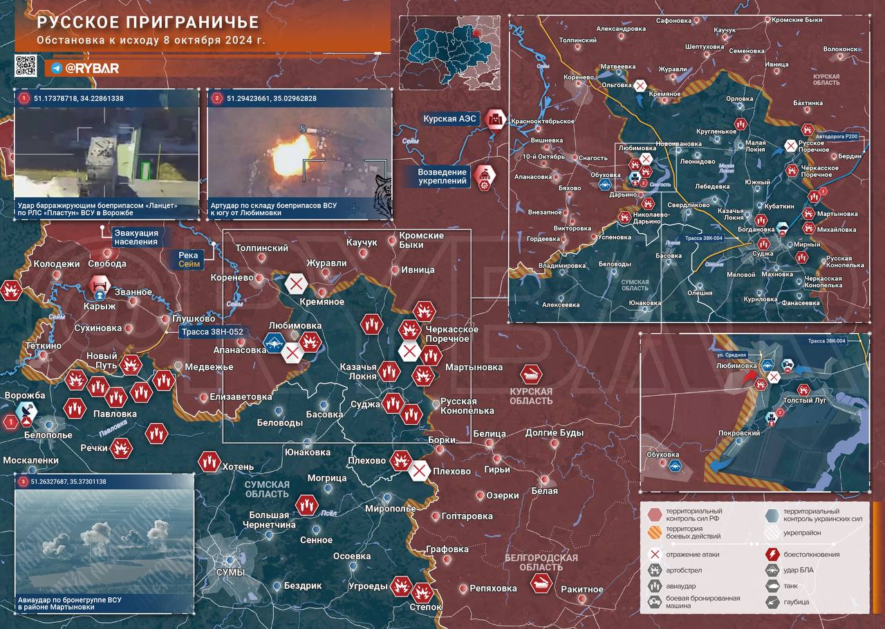 В Суджанском районе ВСУ предприняли атаку бронегруппой в направлении Мартыновки. Российская авиация нанесла удар по подразделениям противника во время их выдвижения с исходных позиций, вынудив их отступить. Также отражены атаки украинских формирований в районе Ольговки, Русского и Черкасского Поречных.