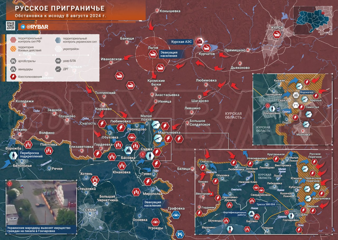В восточной Судже, судя по обрывочным сведениям, сохраняется очаговое присутствие отрядов территориальной обороны и российских войск. При этом также там отмечается работа ДРГ ВСУ, чья задача заключается не в захвате и контроле административного центра, а сеянии паники и достижении медийного эффекта.