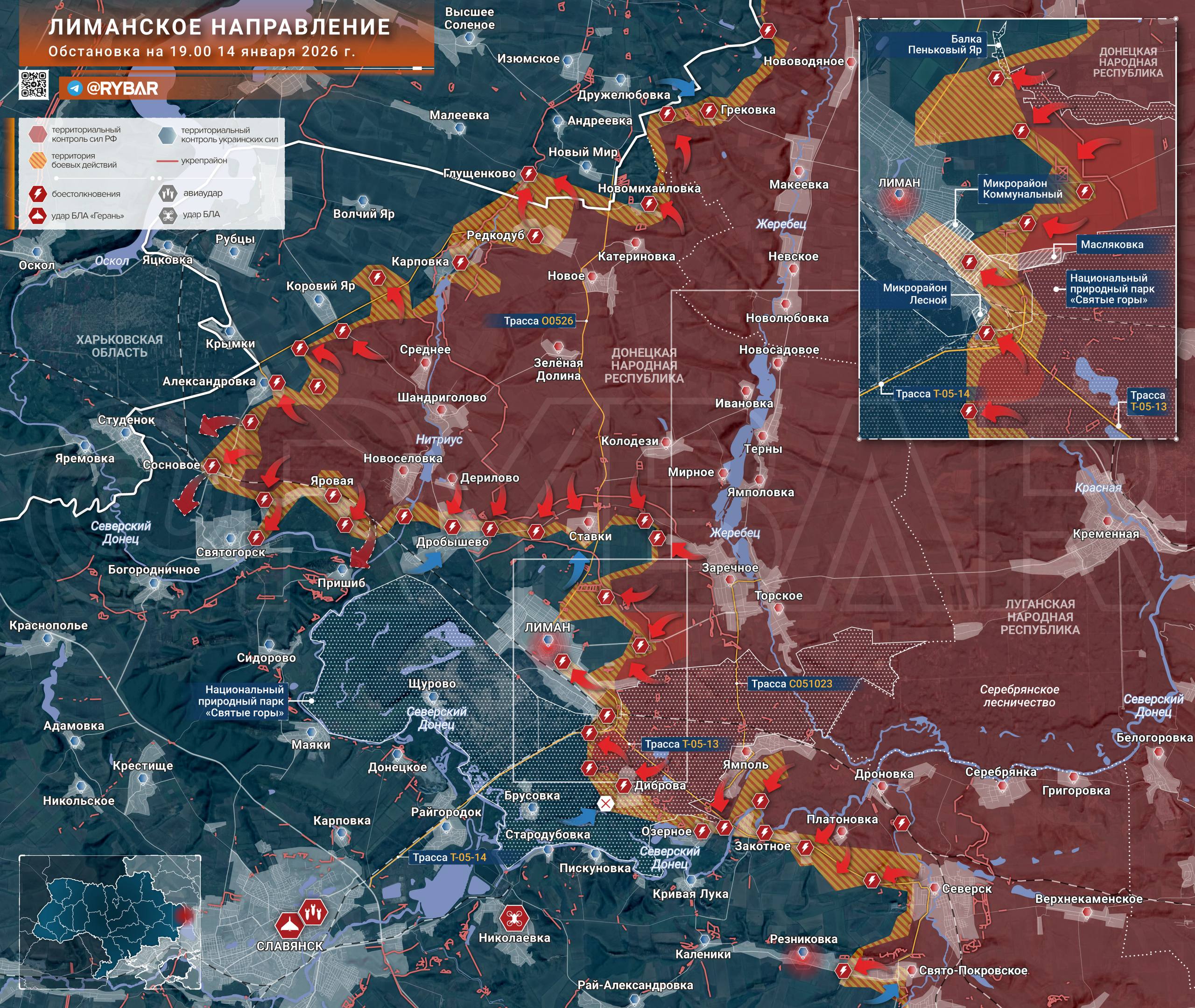 В то же время в массиве парка «Святые горы» штурмовики 25 армии установили контроль над еще одним участком дороги Лиман — Закотное. По некоторым данным, отдельные группы уже завязали бои за микрорайон Лесной на юге населенного пункта.