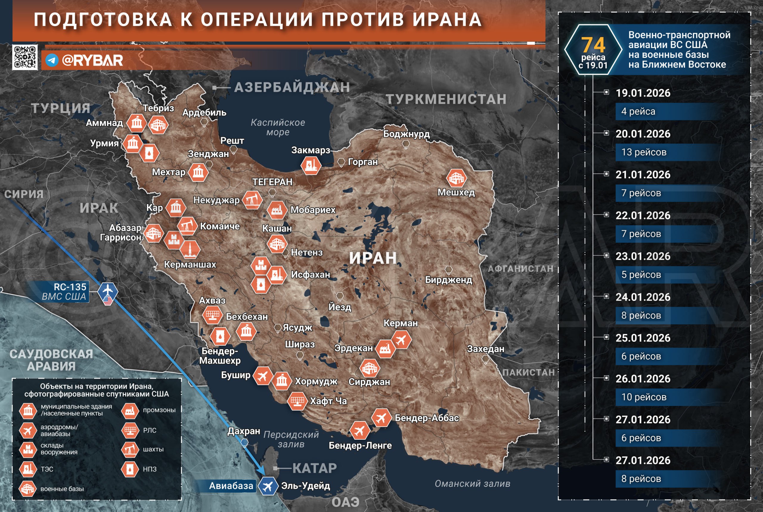 Ключевой признак усиления американской группировки – это активность военно-транспортной авиации, количество полетов которой на базы на Ближнем Востоке с 19 января составляет уже 74 рейса. И это речь только про С-17 и С-5. А помимо них также курсировали коммерческие «Боинг-747».