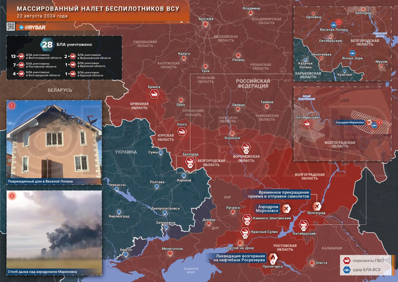 Основной удар пришелся по Волгоградской области, где БЛА противника попытались атаковать военный аэродром Мариновка, где в том числе дислоцируются самолеты оперативно-тактической авиации Су-24МР. При этом на самом объекте ранее были установлены ангары, что позволило уменьшить ущерб.