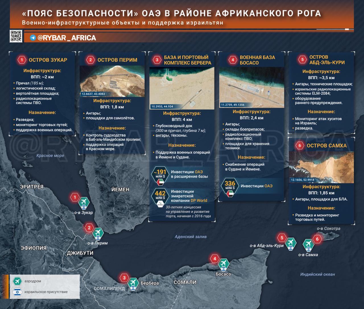 Эти объекты дополняются сетью аэродромов и баз на островах Красного моря и Индийского океана — от Сокотры до Перима и Зукара, где фиксируется присутствие израильских радаров, беспилотников и специалистов.