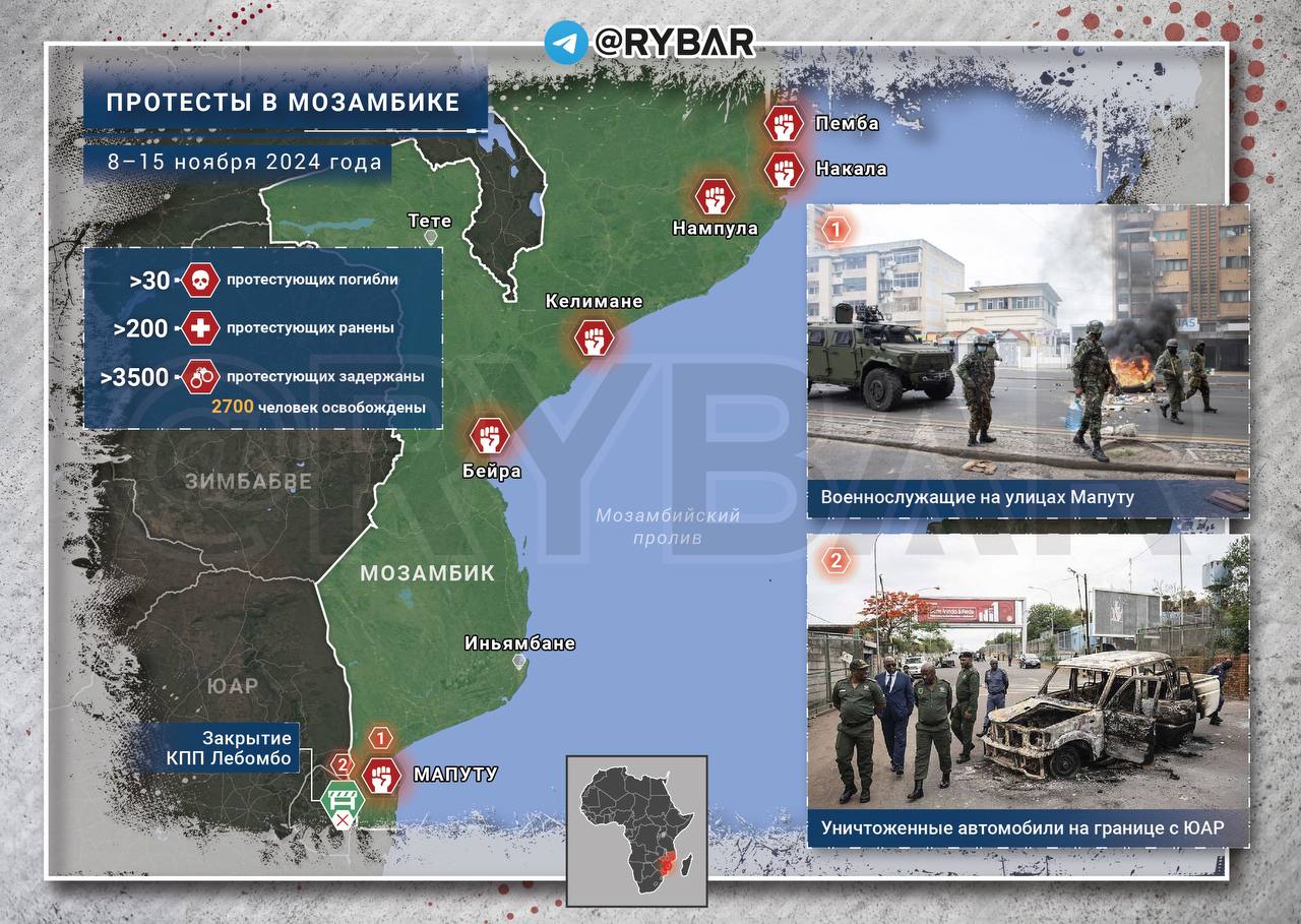 С конца октября в Мозамбике продолжаются ежедневные протестные акции спонсируемой со стороны США оппозиции. Правительство задействовало вооруженные силы для охраны ключевых объектов городов, однако погромы не прекращаются.