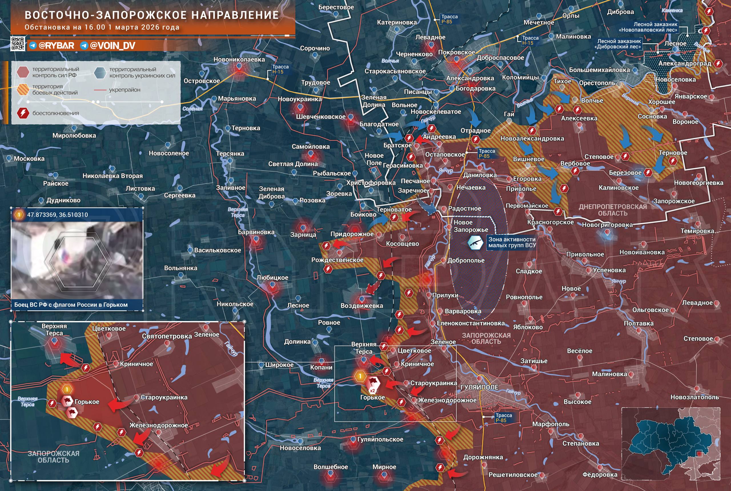 Подразделения 60 мотострелковой бригады к 28 февраля выбили ВСУ из Горького и подняли над селом государственные флаги. Освобождение Горького позволит частям ГВ «Восток» развивать наступление дальше на запад вдоль линии обороны ВСУ по Верхней Терсе, «рассекая» порядки противника вдоль реки.