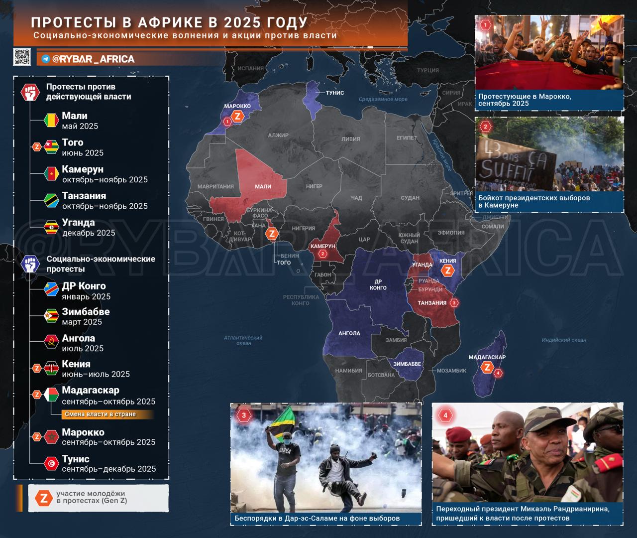 Осенью молодёжные протесты охватили Мадагаскар и Марокко — правда, итог этих акций оказался разным. В Мадагаскаре выступления начались в конце сентября в Антананариву и других городах из-за перебоев с водой, электричеством и экономической нестабильности. Первоначально акции носили социальный характер, но вскоре переросли в антиправительственные, и привели к смене власти.