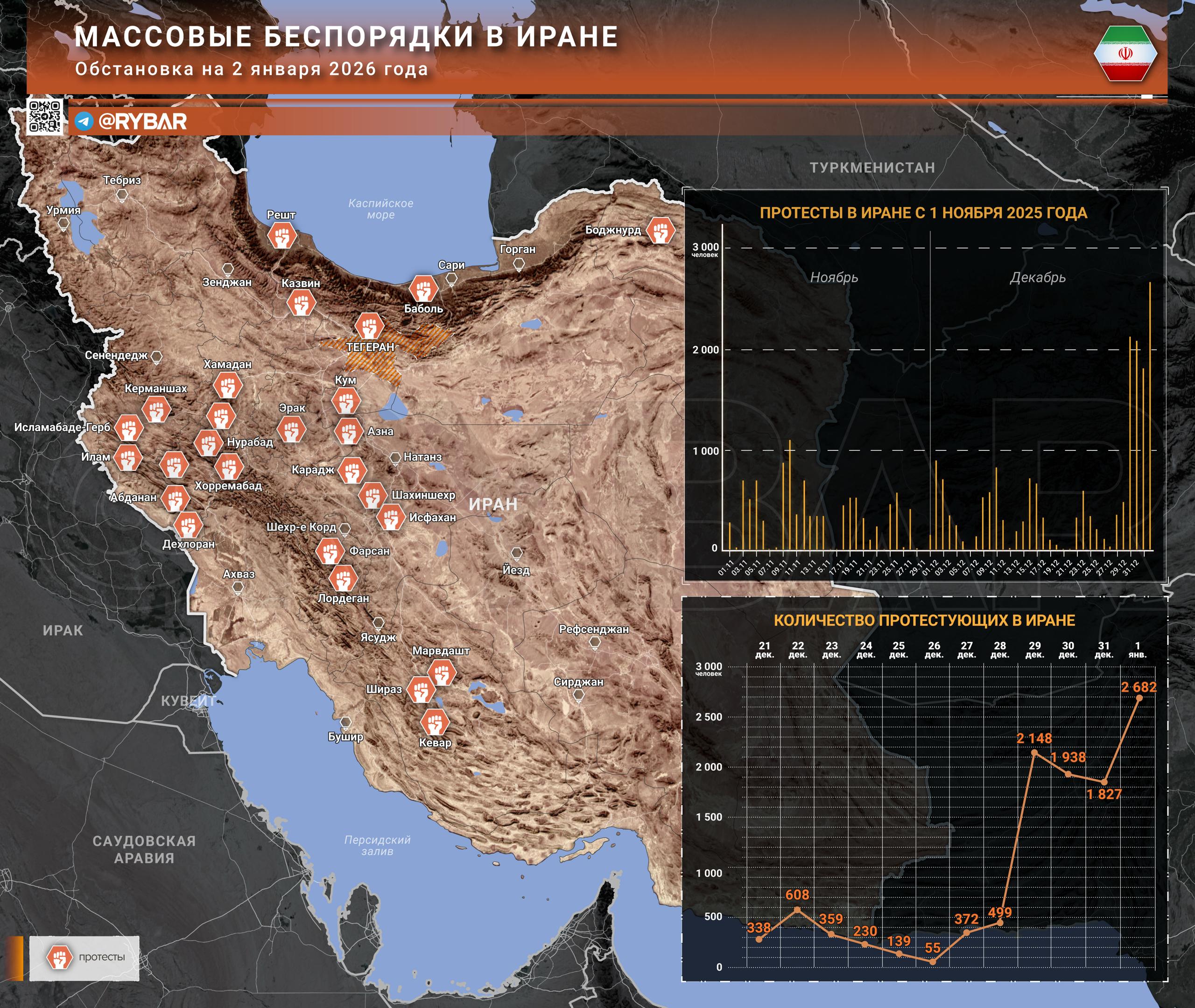 Беспорядки в Иране постепенно набирают ход. Ко 2 января возросло количество протестующих, а география митингов и протестов также становится все шире.