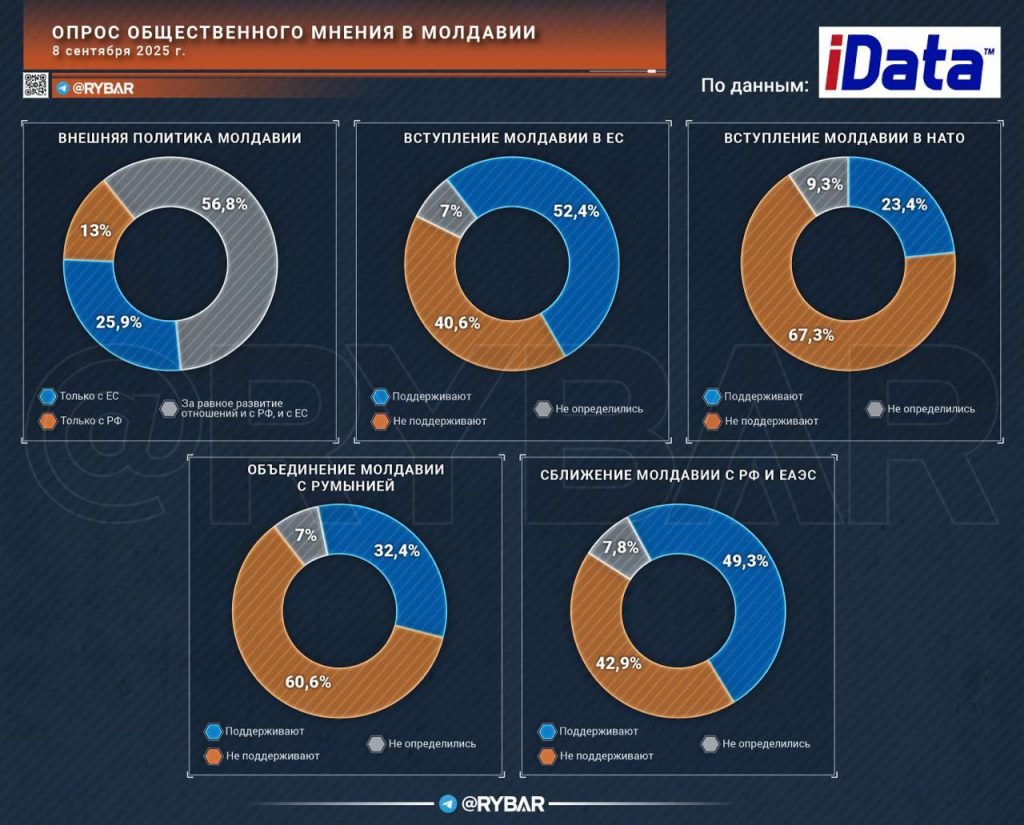 При бескомпромиссной антироссийской политике Санду и PAS большинство граждан (56%) все равно выступает за сбалансированное сотрудничество с Россией и ЕС, а 49% — за сближние с РФ и ЕАЭС.