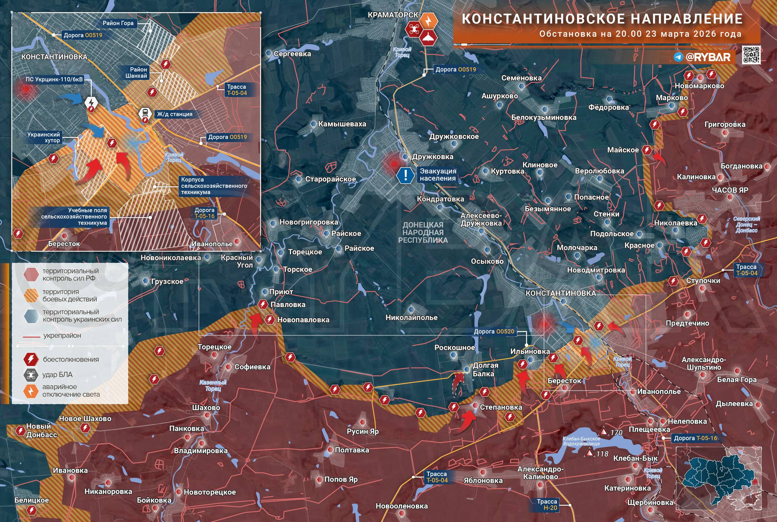 На Константиновском направлении развиваются тяжелые бои в городе и на подступах. Пока противник пытается укрепить собственные позиции в Красном и на окраинах Часова Яра, российские малые группы продолжают углубляться в Константиновку.