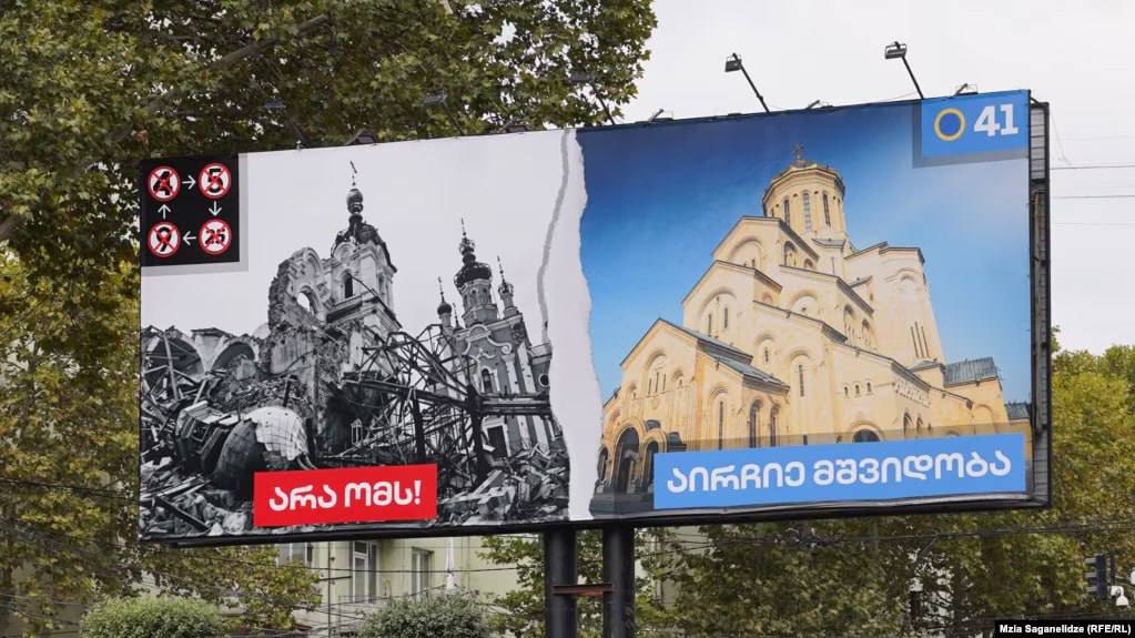 В рамках предвыборных мероприятий правящая грузинская партия организовала любопытную информационную кампанию. В Тбилиси появились баннеры, на которых противопоставляются кадры разрушений в ходе боев на территории т.н. Украины и картины благополучной Грузии.
