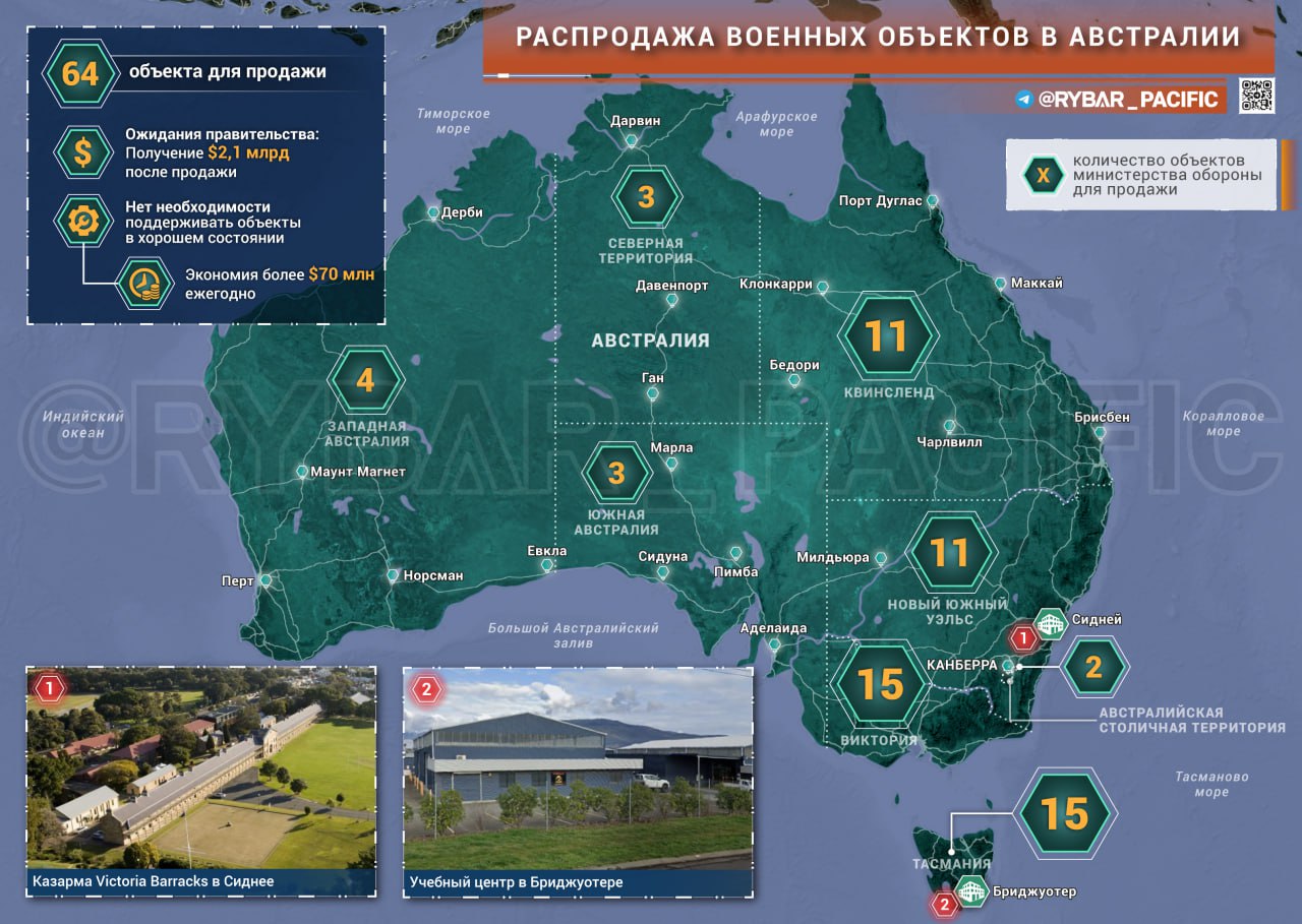 Австралийцы подоспели с новым грандиозным планом, навеянным нарративом о «китайской угрозе». В Канберре решили продать более 60 объектов, находящихся во владении местного оборонного ведомства, с целью сэкономить и перераспределить деньги на более важные нужды.