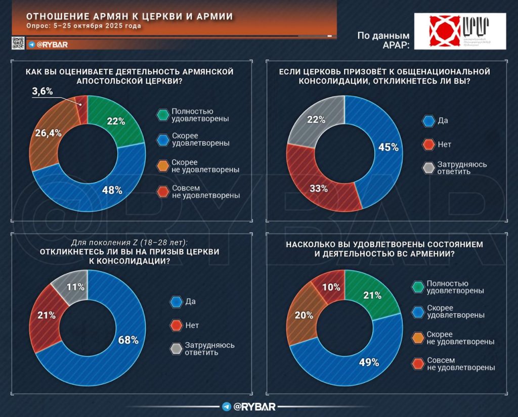 Опрос «Фонда цивилизационных исследований» (АРАР) показывает, что 70% граждан Армении удовлетворены деятельностью Армянской церкви и почти половина (45%) готова откликнуться на призыв духовенства к общенациональной консолидации. Причем среди молодежи готовность к действиям по призыву церкви — выше среднего (68%).