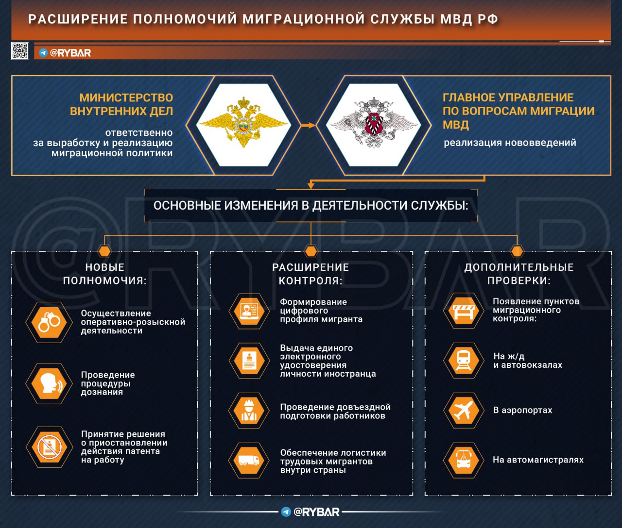 Миграционная служба МВД РФ теперь наделена правом осуществлять оперативно-розыскную деятельность и проводить дознание. Служба также уполномочена самостоятельно принимать решение о приостановлении действия патента на работу.