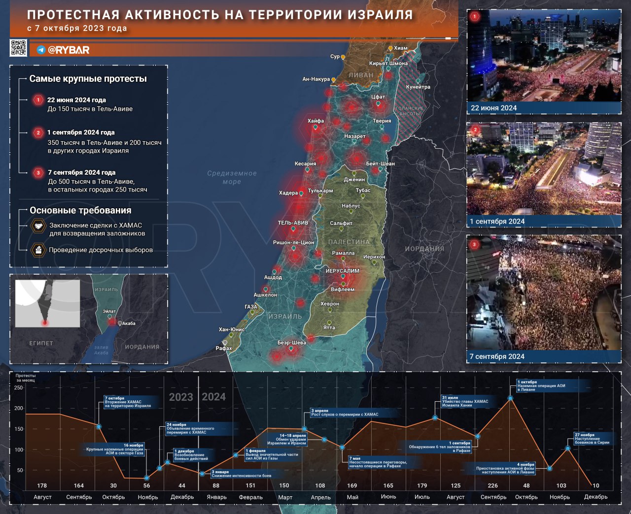 Впоследствии немного утихомирить население удалось лишь убийством главы ХАМАС Исмаила Хании в Тегеране, тем не менее после обнаружения тел шести заложников в Рафахе во время «спасательной» операции страну вновь захлестнули массовые демонстрации. А вот унять недовольных помогло резкое обострение конфликта с «Хезболлой»: количество акций уменьшилась практически на 80% с 226 акций в сентябре до 48 в октябре.