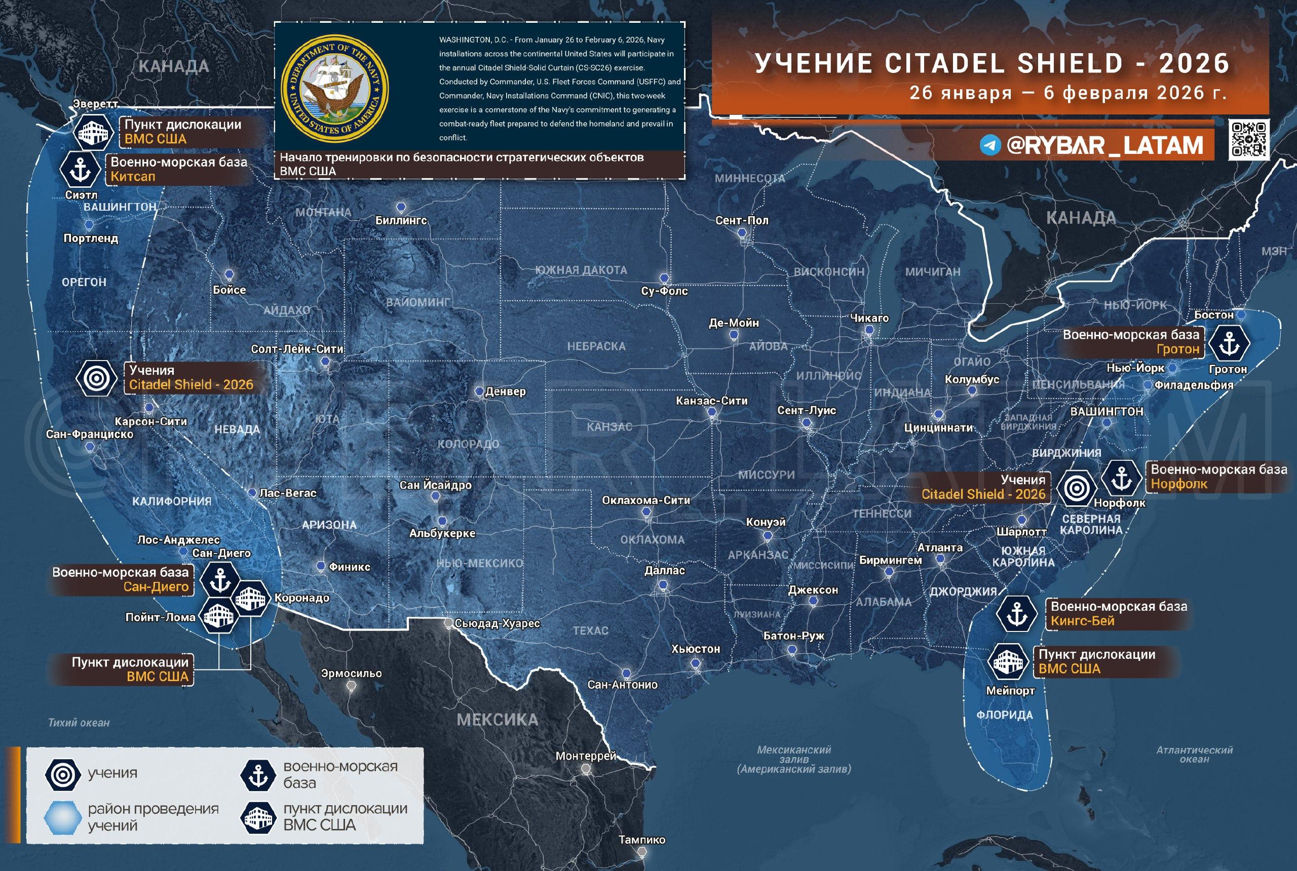 С 26 января по 6 февраля на восточном и западном побережье США идёт учение Citadel Shield, в рамках которого отрабатывается контртеррористическая защита военно-морских баз ВМС США.