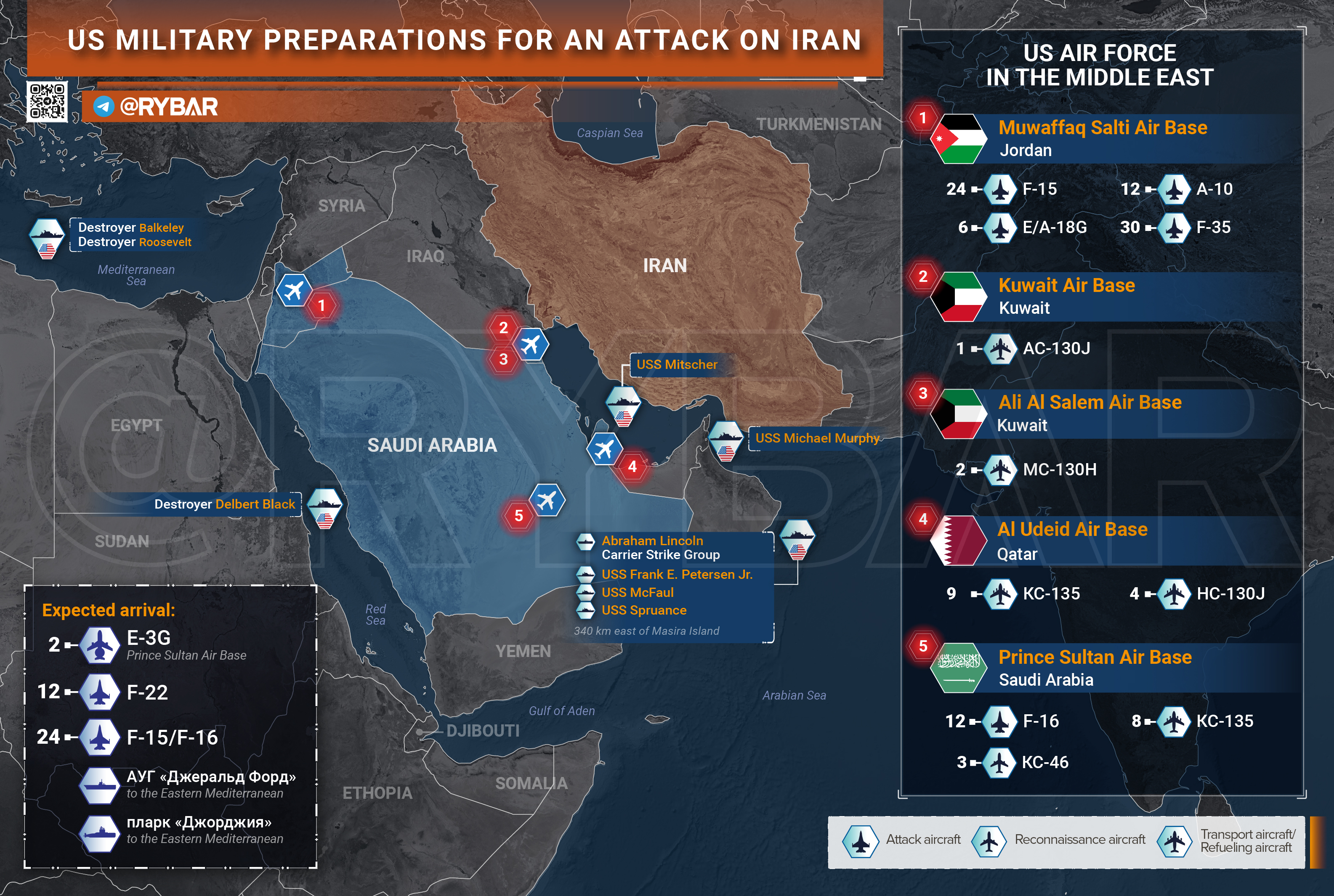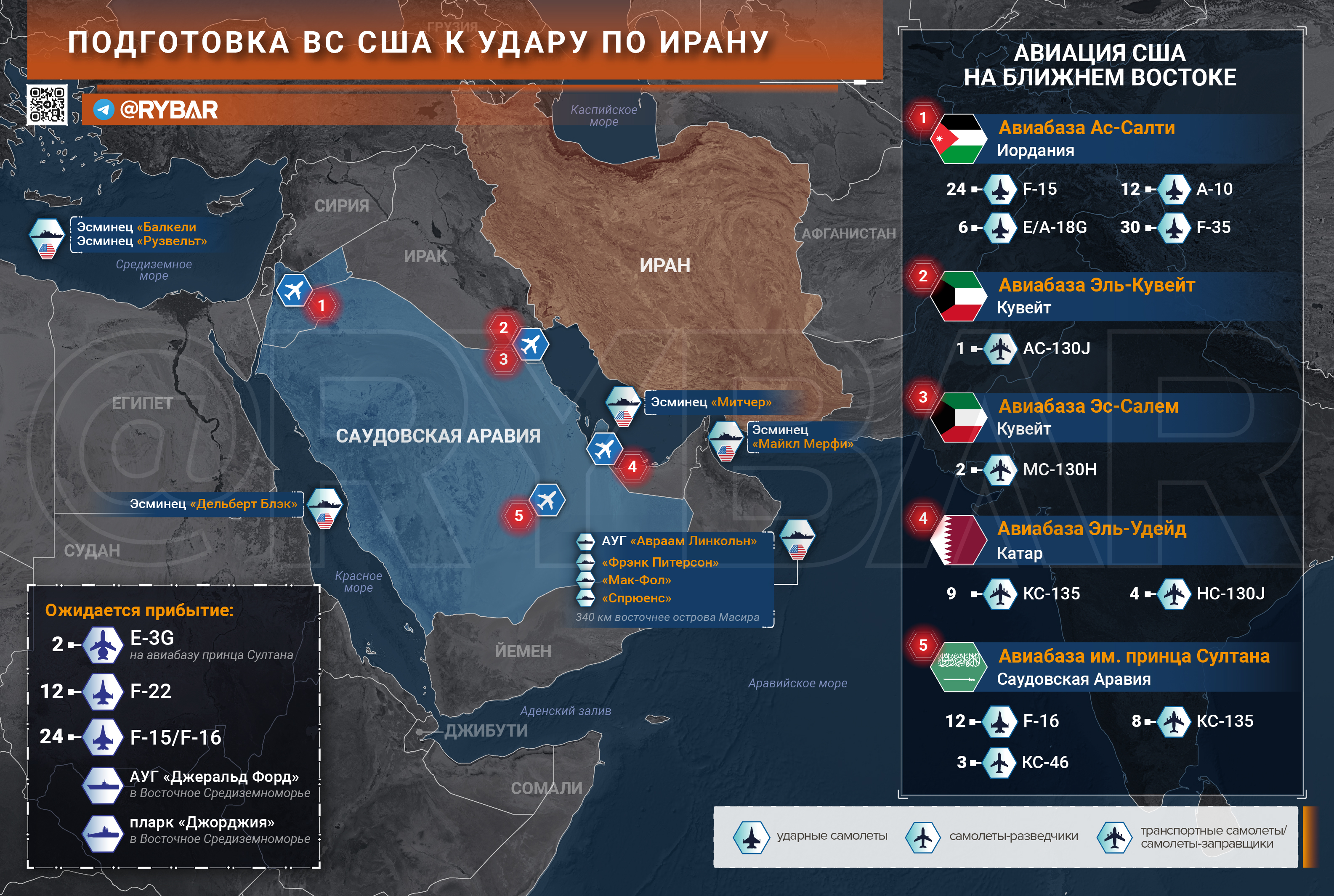 С территории США, предварительно, осуществляет перелет 12 истребителей F-22. Кроме того, ожидается перелет от 24 до 36 самолетов F-16 и F-15 – также в Иорданию. И два самолета ДРЛО Е-3G летят в Саудовскую Аравию.